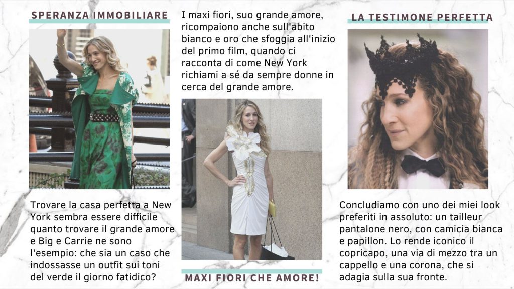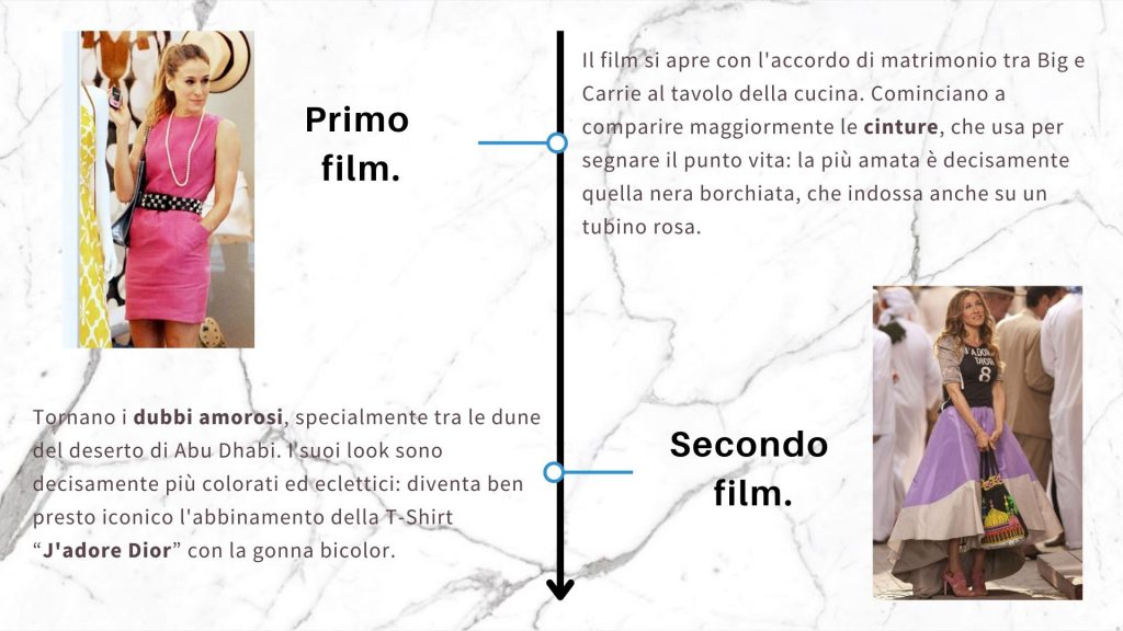 Il primo film si apre con Carrie e Big alla ricerca di un nuovo e bellissimo appartamento in cui vivere finalmente felici e contenti: sappiamo che in entrambe le pellicole la loro storia d’amore vivrà alti e bassi, ma sempre assolutamente fashion.