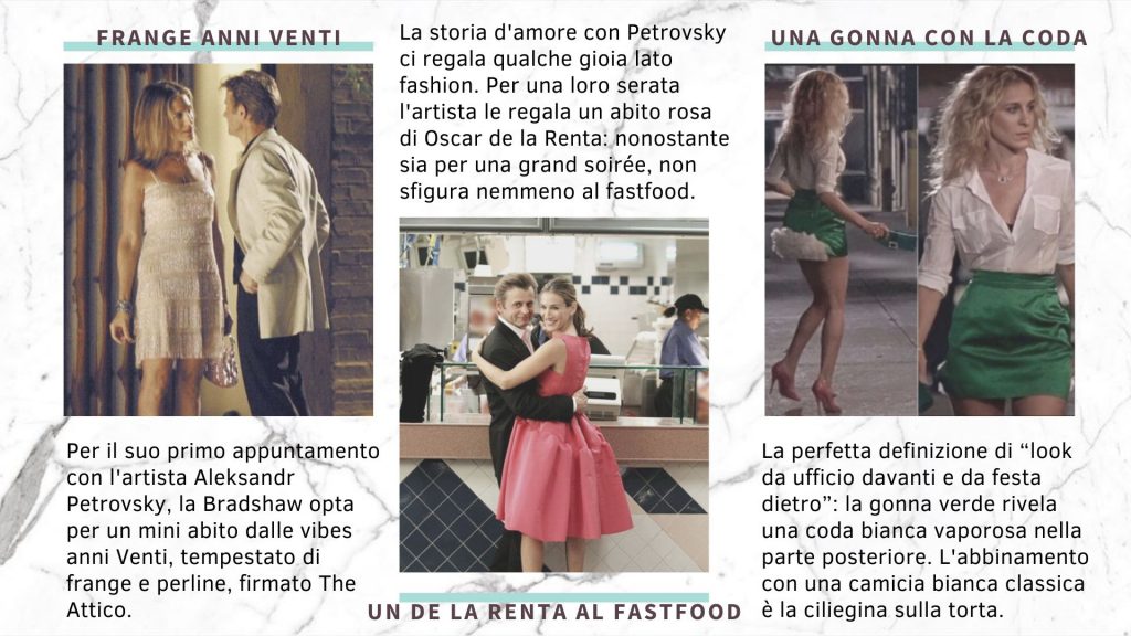 Riguardando i look che la sex expert ha sfoggiato per le vie di New York, possiamo notare che il suo stile personale si evolve con lei, rimanendo però sempre fedele a sé stesso. La stessa Bradshaw ha detto, in una puntata: “Vestiti sempre come ti senti, per riflettere il tuo modo d’essere prima ancora del tuo stile, perché bisogna indossare qualcosa che piace prima di tutto a sé stessi e solo dopo agli altri.“