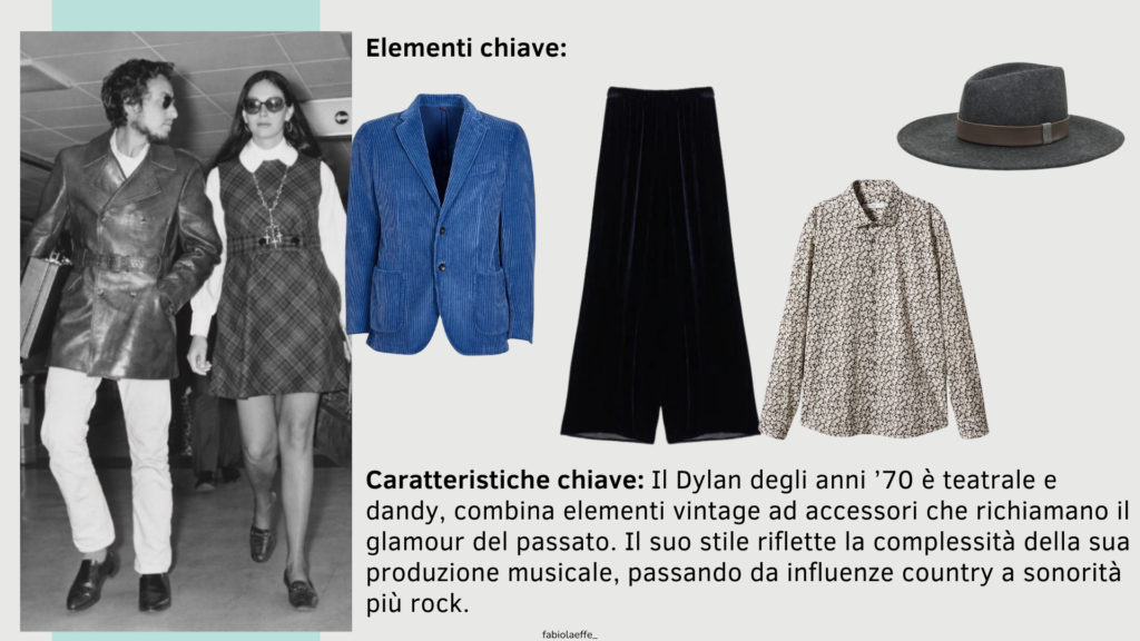 Con l’arrivo degli anni ’70, Bob Dylan evolve il suo stile, abbracciando una raffinata eleganza bohemien. Questo decennio è segnato da una transizione verso un look più curato, in linea con la sua esplorazione di nuovi generi musicali.