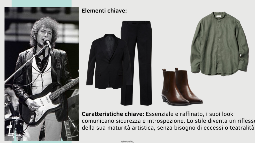 Con l’arrivo degli anni ’90, Bob Dylan abbraccia uno stile più minimalista e maturo, in linea con la sua evoluzione personale e artistica. Il focus è sulla qualità dei materiali e sulla semplicità delle forme.