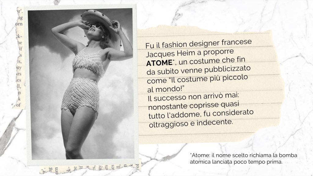 In quello stesso periodo l’atollo statunitense al largo dell’Oceano Pacifico, divenne il centro nevralgico di alcune operazioni militari: l’esercito stava infatti testando gli effetti di una bomba nucleare, se sganciata in mare aperto. Réard disse che voleva che il suo costume doveva avere l’effetto di una bomba sulla società e la moda femminile.