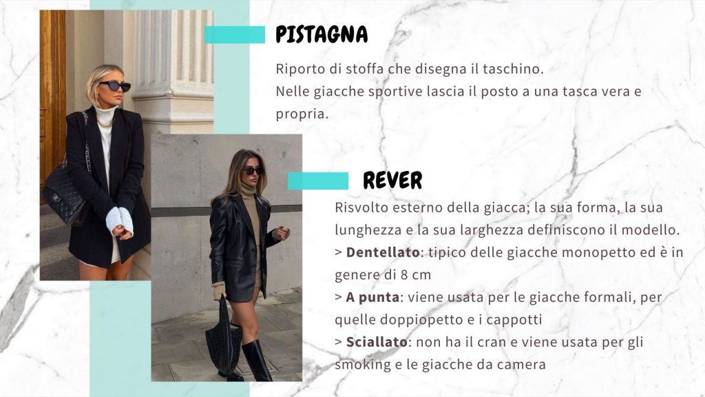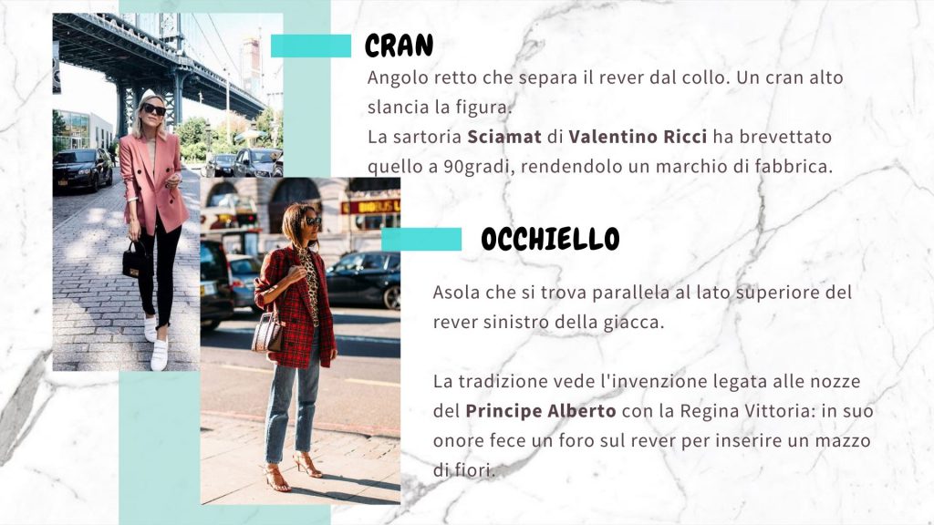 Si compone di elementi essenziali, la cui presenza o assenza è in grado di definire l’occasione d’uso e il livello di eleganza della giacca.