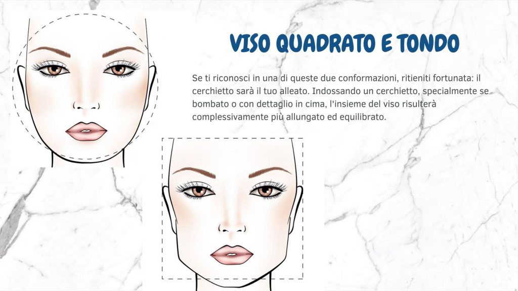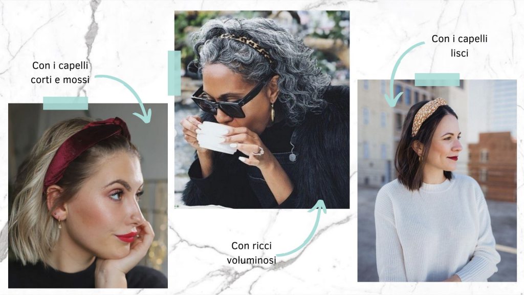 Come dicevamo, il cerchietto focalizza l’attenzione sul viso: otticamente il viso sembrerà più lungo, quindi può essere usato per riequilibrare le proporzioni.