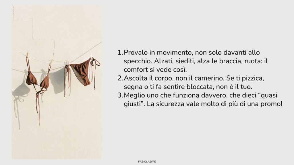 Dopo aver capito cosa ti fa sentire a tuo agio e quali modelli possono valorizzarti davvero, arriva il momento più importante: quello della scelta reale. In negozio, online, in camerino — quando il costume lo hai davanti (o già addosso), è lì che entrano in gioco alcuni accorgimenti fondamentali.