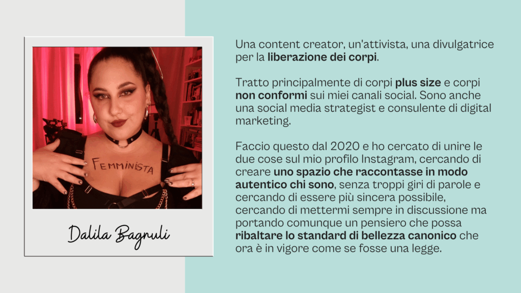 Content creator, attivista e divulgatrice per la liberazione dei corpi, dal 2020 usa la moda e la comunicazione digitale per raccontare ciò che spesso viene taciuto: la verità sulle discriminazioni, sulla grassofobia, sull’accettazione impossibile e sulla rappresentazione che manca. La sua è una voce lucida, rabbiosa al punto giusto, profondamente femminista.