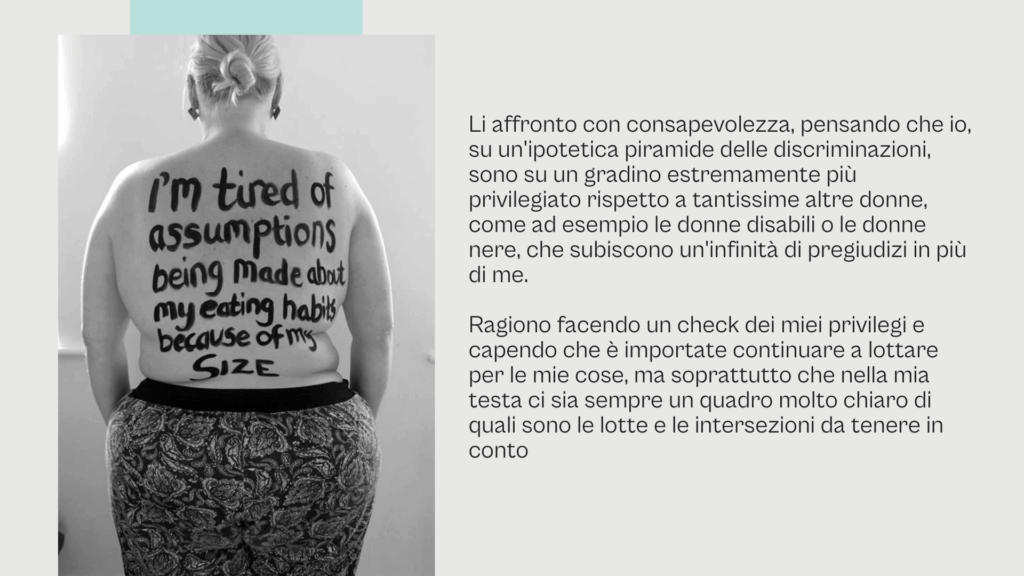 Ci sono poi i pregiudizi collegati alle discriminazioni: quella sessista e quella grassofobica, in quanto donna grassa.