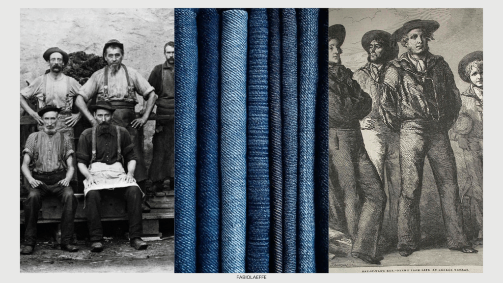 Il denim ha radici profonde nel tessuto sociale ed economico europeo. Già nel Quattrocento, a Chieri (Piemonte) si produceva un resistente fustagno blu, molto apprezzato per la sua robustezza. Questo tessuto veniva esportato attraverso il porto di Genova, da cui il nome “Blue de Gênes” e diventato poi “Blue Jeans”. Parallelamente, in Francia, nella cittadina di Nîmes, nasceva un tessuto simile: il “serge de Nîmes”, da cui il termine “denim”.