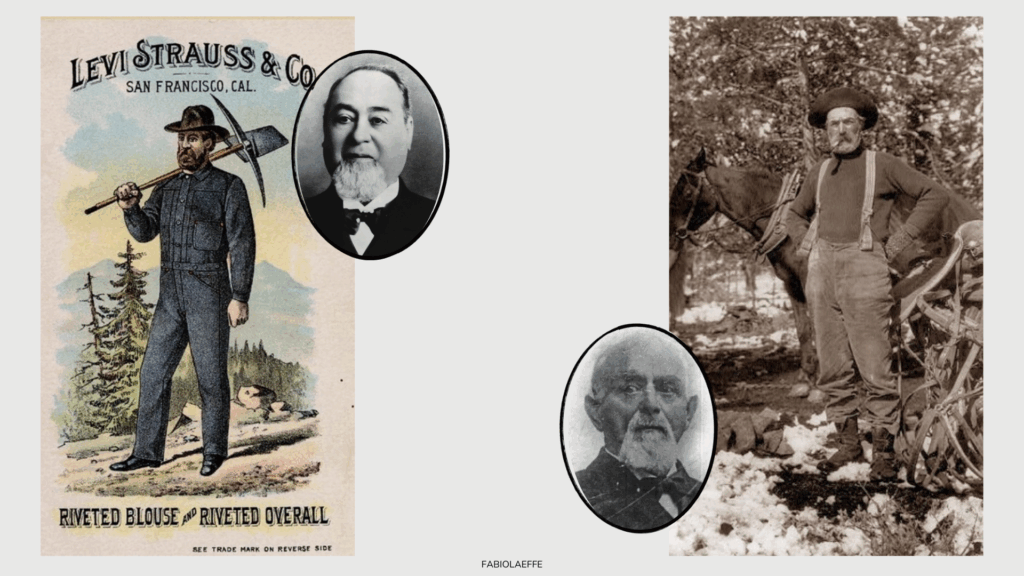 Levi Strauss, emigrato tedesco e imprenditore, fonda la Levi Strauss & Co. a San Francisco, fornendo abbigliamento resistente ai cercatori d’oro. L’intuizione vincente arriva con il sarto Jacob Davis, che inventa i rivetti in rame per rinforzare le tasche. Insieme, brevettano ufficialmente il jeans il 20 maggio 1873.