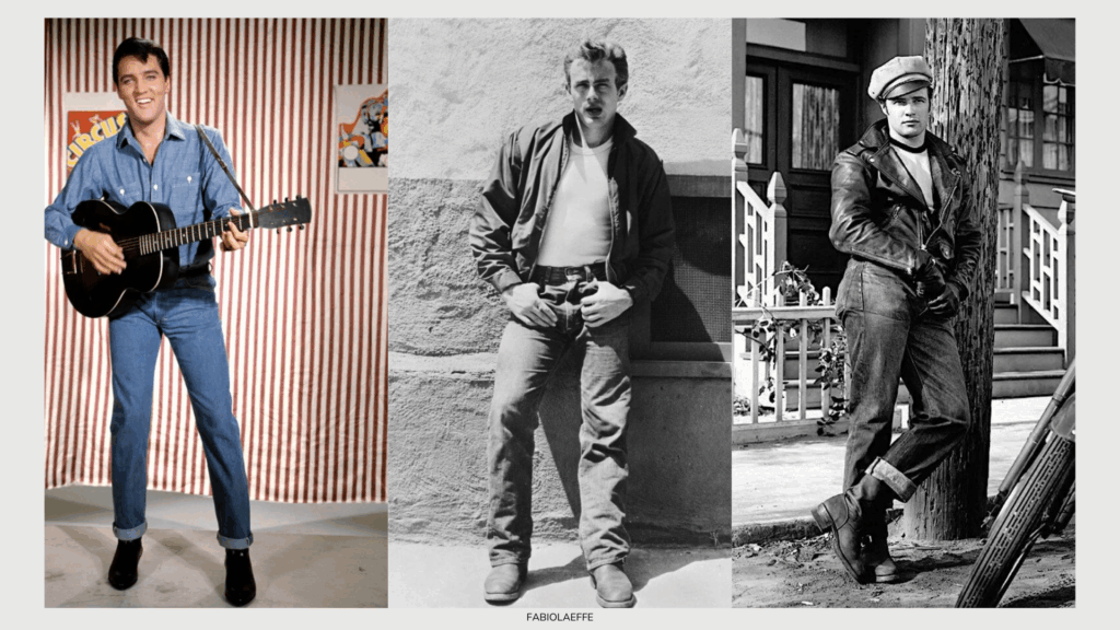 Negli anni ’50 e ’60, il denim si stacca dall’immagine da workwear per entrare nel mondo della ribellione giovanile. Elvis Presley, James Dean e Marlon Brando rendono i jeans il manifesto del cambiamento: un simbolo di libertà, anticonformismo e nuova identità culturale.