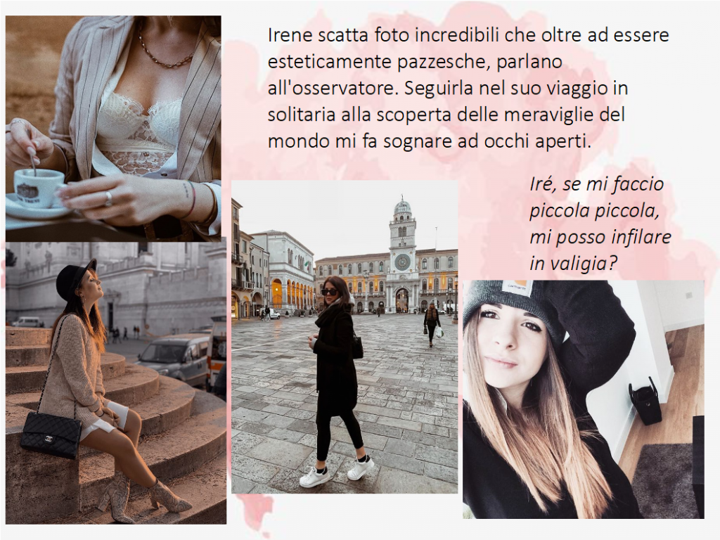 Come posso descrivervi Irene? Lei è un vortice di creatività e bellezza, di forza e indipendenza che mi contagia sempre. La seguo da anni: l’ho scoperta tramite i suoi scatti londinesi e non l’ho più lasciata.