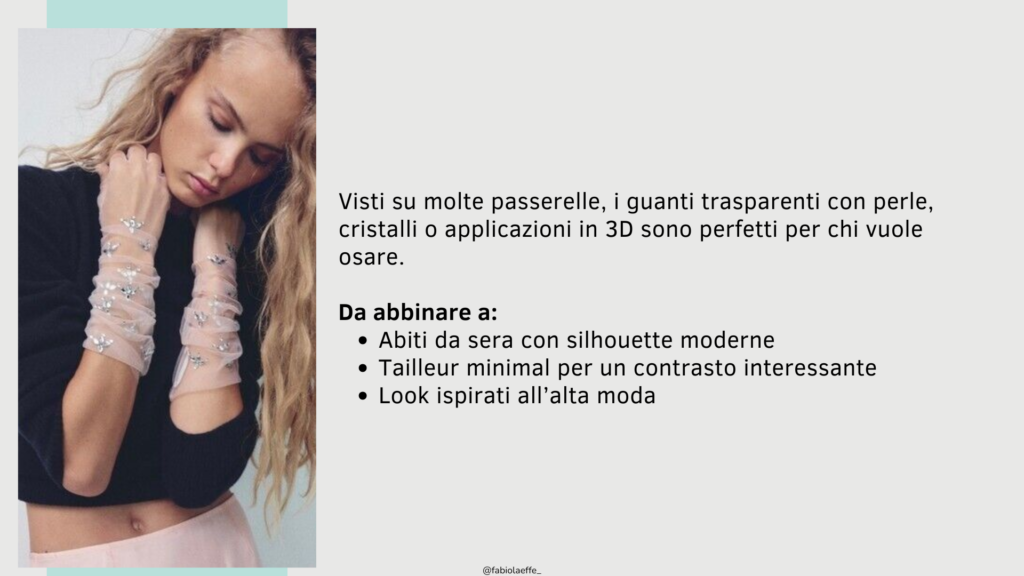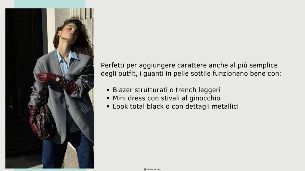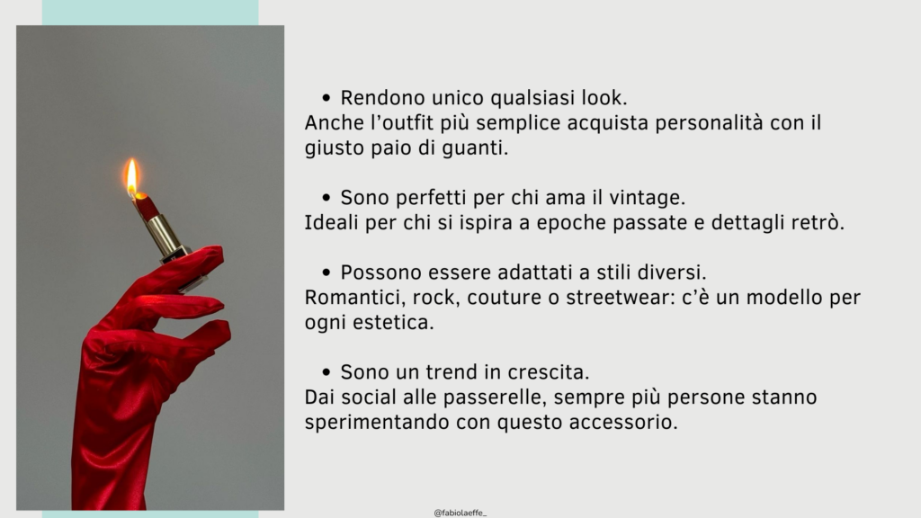 Oggi, grazie al revival della moda vintage e al desiderio di dettagli unici nei look contemporanei, i guanti stanno tornando a essere protagonisti, non più per necessità, ma per puro statement fashion.