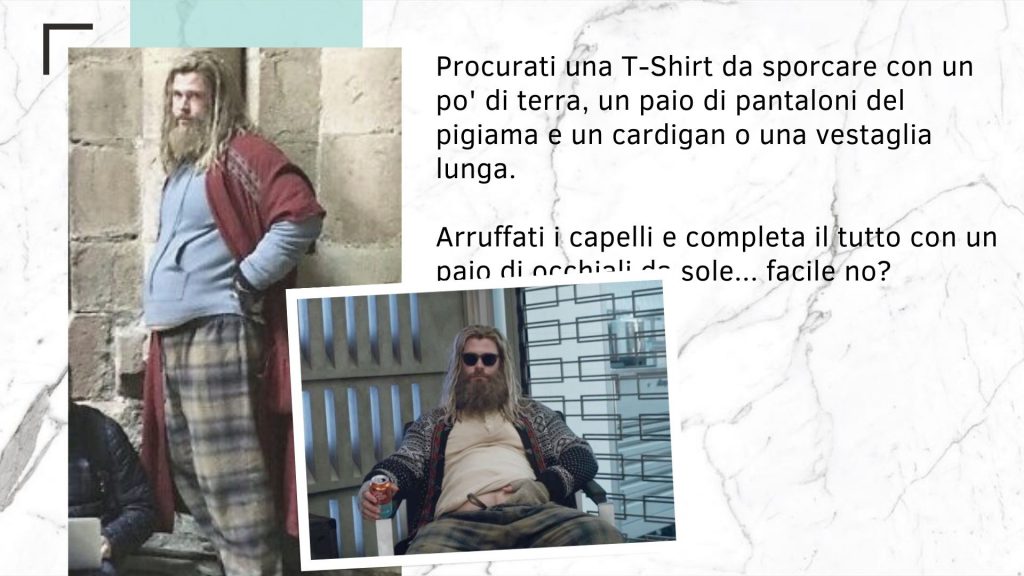 Appassionata di Marvel, a me gli occhi! Stupisci tutti ispirando a Thor ubriaco e perennemente in pigiama… Lo sforzo sarà minimo, starai comoda e sicuramente lascerai a bocca aperta tutti!