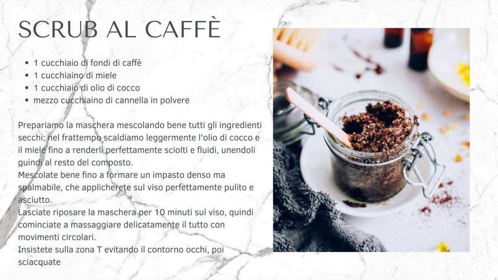 - Dedica qualche minuto al viso: ora che i vapori del bagno hanno aperto i pori, parti con uno scrub delicato a base di caffè, poi applica una maschera idratante. E non dimenticarti di prenderti cura del contorno occhi!