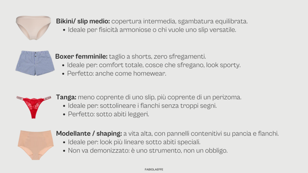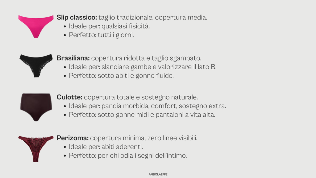 Quando parliamo di slip, dobbiamo mettere al centro la ricerca dell’equilibrio tra comfort, praticità e la linea che vuoi dare ai tuoi look: c’è quello che scompare sotto un abito aderente, quello che offre maggiore coprenza, quello che segue i movimenti senza segnare.