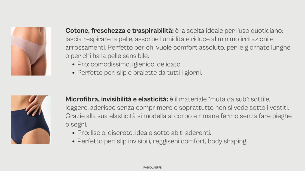 Scegliere il materiale giusto è fondamentale perché ogni fibra ha un comportamento diverso sulla pelle e sotto i vestiti. Conoscerli ti permette di scegliere l’intimo adatto alla tua giornata, non solo quello “carino”.