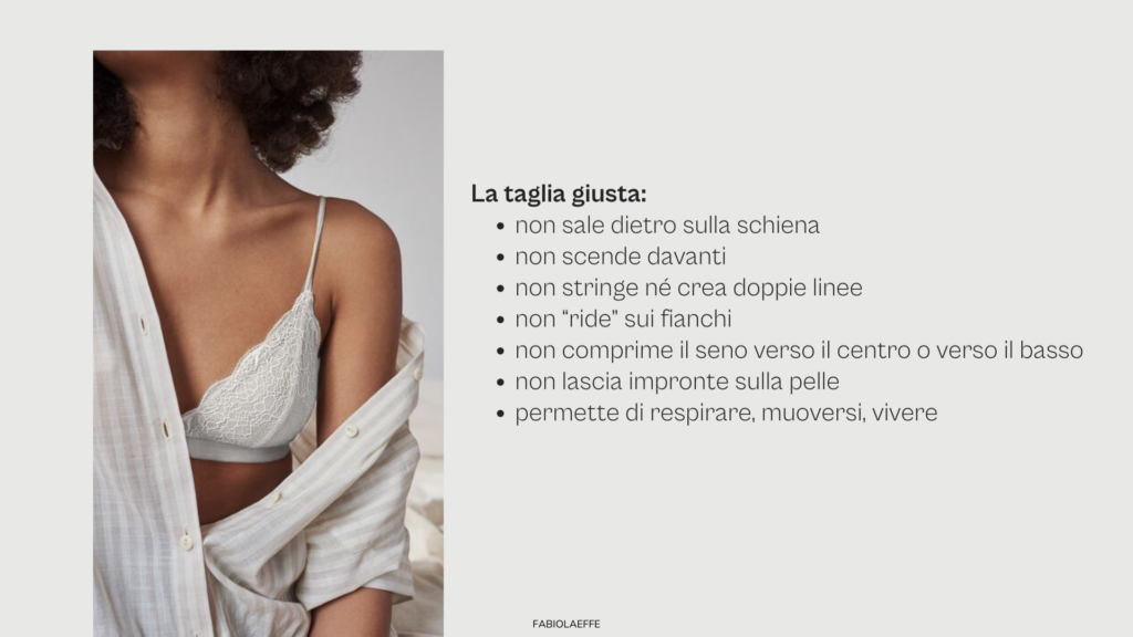 Un reggiseno della taglia “giusta” non si sente addosso: sostiene, distribuisce il peso e non lascia segni. Uno slip della misura corretta accompagna il corpo, non lo taglia.