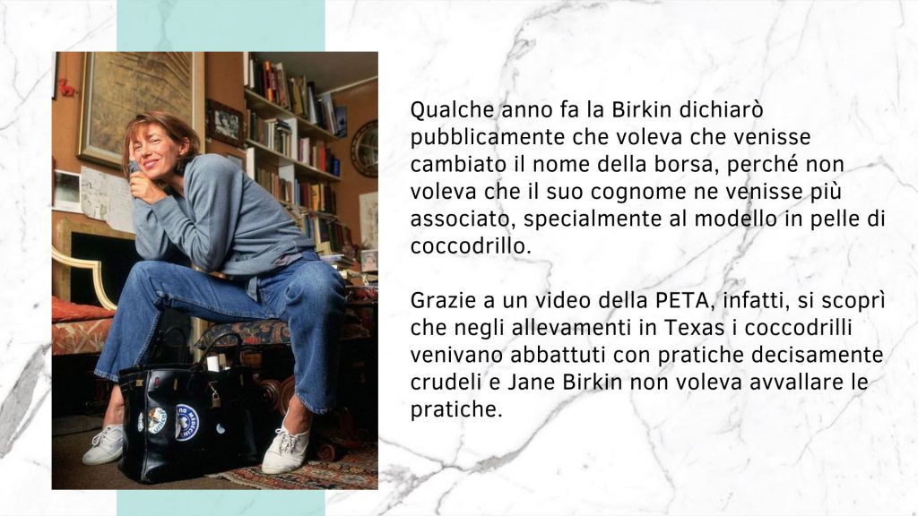 Nota animalista, Jane Birkin l’ha usata spesso come mezzo per le campagne in sostegno delle associazioni di cui faceva parte, attaccandoci adesivi e slogan.