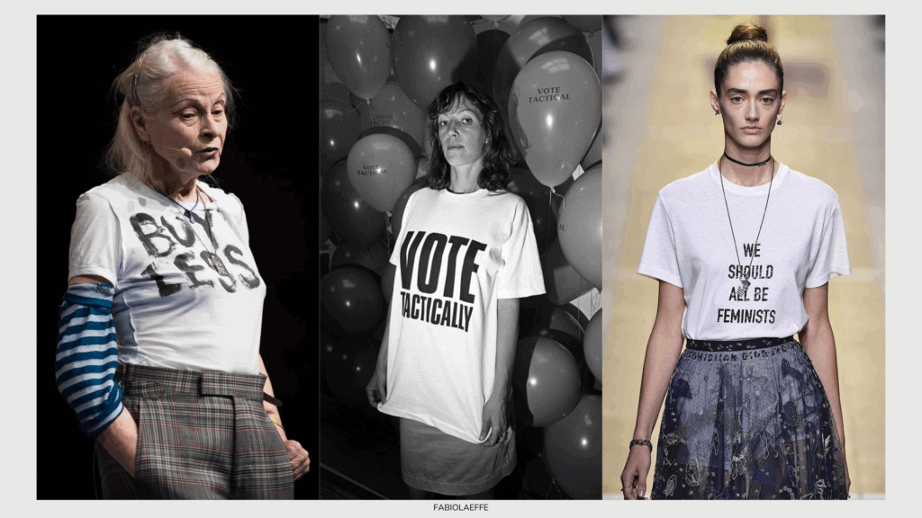 Negli anni ’70 e ’80 la maglietta bianca si trasforma in supporto per idee, lotte, identità. Dai tour delle band rock alle manifestazioni politiche, è un manifesto indossabile. Vivienne Westwood la carica di ironia e provocazione. Katherine Hamnett lancia i suoi slogan pacifisti in passerella. E le celebrity continuano a farne uso: pensiamo a quelle con scritte ironiche, sarcastiche, femministe. Una semplice t-shirt bianca può dire tutto, se si sa come scriverci sopra.