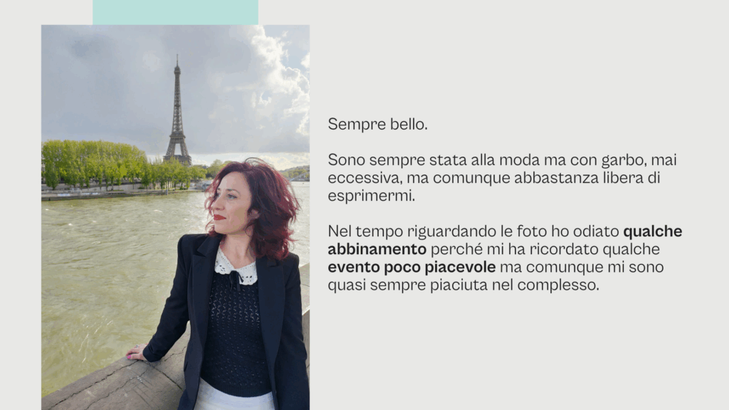 Forse si è evoluto poco. I colori mi sono sempre piaciuti ma non sono un tipo stravagante o troppo estroso. Esalto la giusta femminilità.