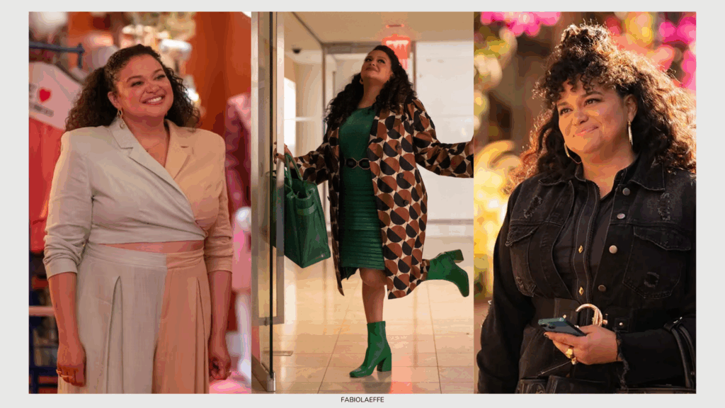 Un altro aspetto potente del guardaroba di Mavis e, più in generale, della narrazione visiva costruita attorno a Michelle Buteau, è l’omaggio costante all’heritage afro e caraibico. Tessuti, colori, texture e accessori scelti non sono mai casuali, ma parlano di orgoglio, appartenenza e radici.