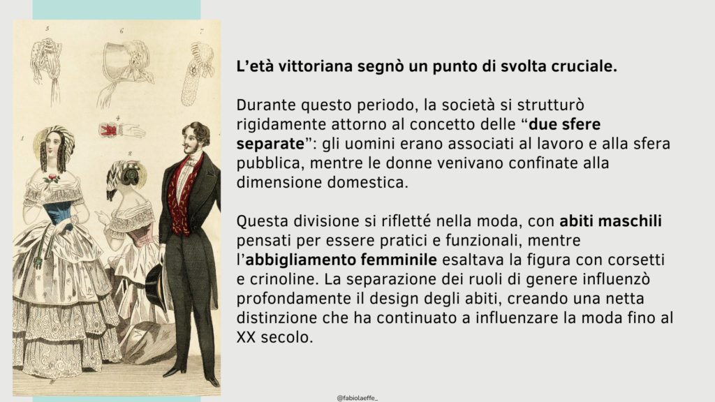 Questa divisione si rifletté nella moda, con abiti maschili pensati per essere pratici e funzionali, mentre l’abbigliamento femminile esaltava la figura con corsetti e crinoline. La separazione dei ruoli di genere influenzò profondamente il design degli abiti, creando una netta distinzione che ha continuato a influenzare la moda per tutto il XX secolo.