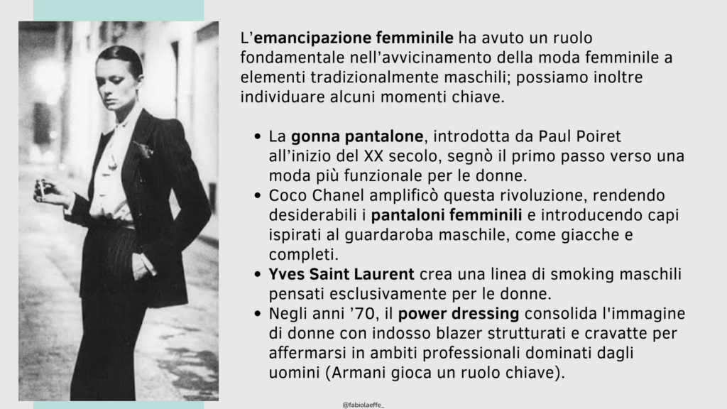 Oggi, capi come pantaloni a sigaretta, trench e mocassini sono considerati elementi essenziali sia per uomini che per donne, dimostrando come la moda femminile abbia integrato con successo codici maschili.