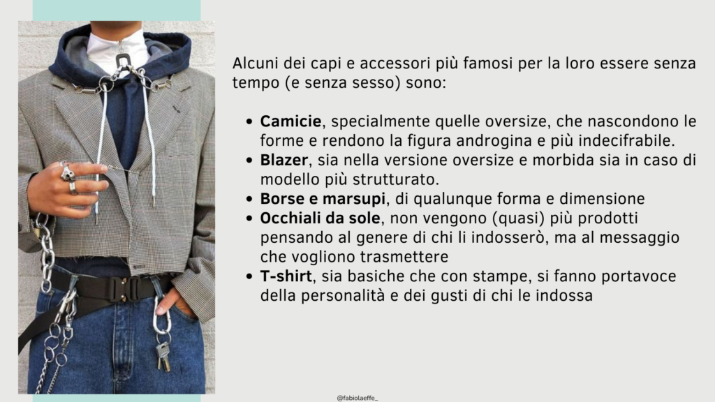 Altri capi e accessori nel tempo sono diventati genderless, trovando collocazione in guardaroba molto diversi tra loro.