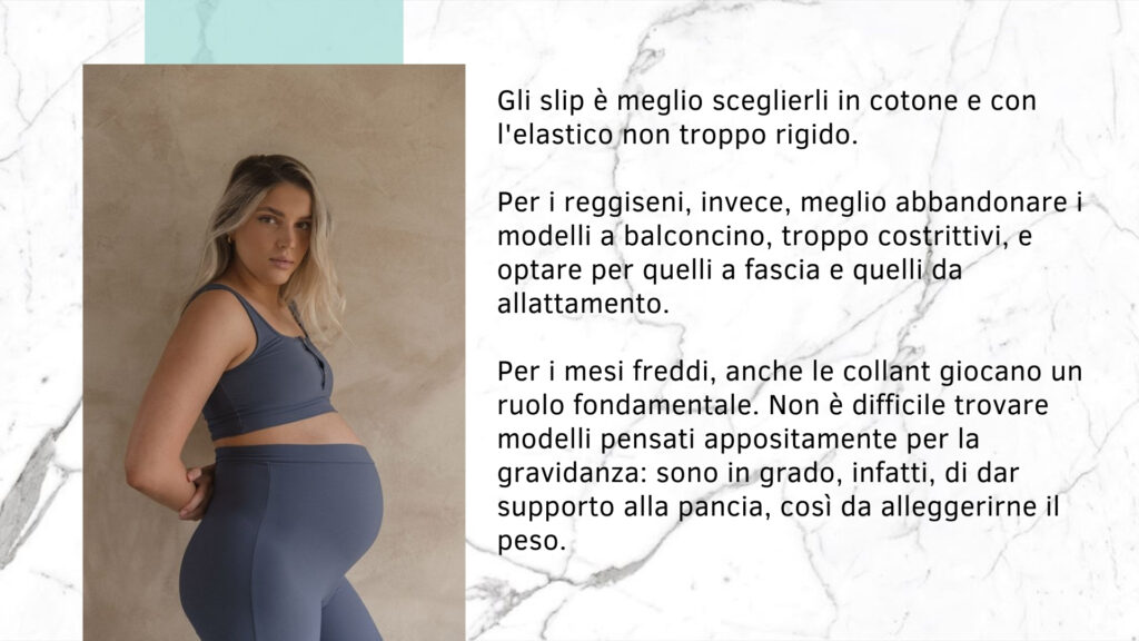 In gravidanza occorre prestare particolare attenzione anche alle etichette: un tessuto di buona qualità eviterà di irritare la pelle, che per colpa degli ormoni può essere particolarmente sensibile.