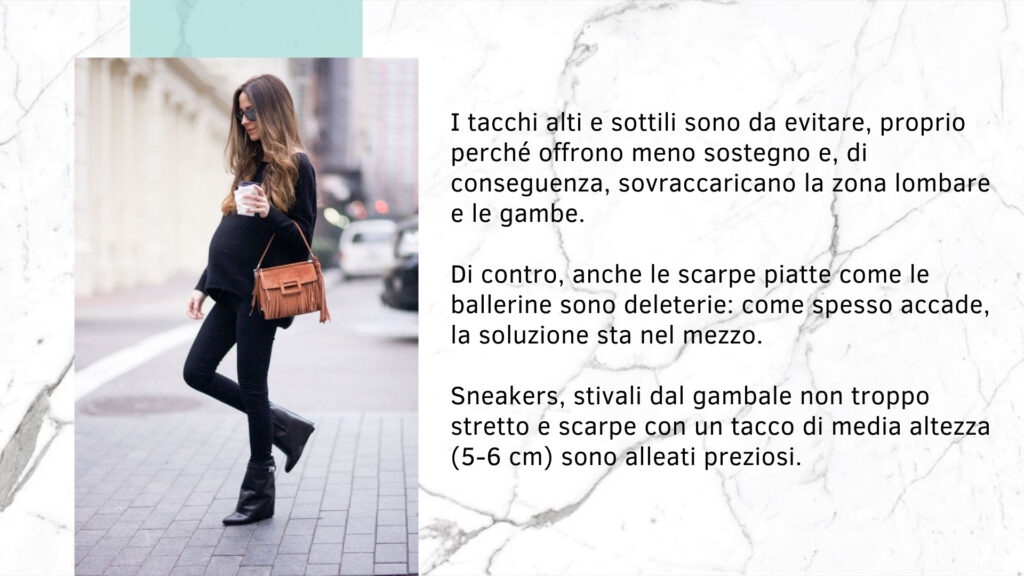 La comodità passa anche dalle scarpe, soprattutto in gravidanza: in questo periodo di grandi cambiamenti fisici, la schiena e le gambe sono quelle più sollecitate (specialmente da metà gravidanza in poi).