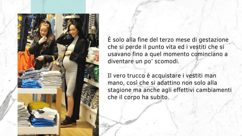 “Quando devo rinnovarlo e comprare i primi capi premaman?” Ogni donna e ogni gravidanza sono diverse ma, in generale, durante il primo trimestre il peso della maggior parte delle donne non varia, si arrotonda giusto un po’ la pancia.