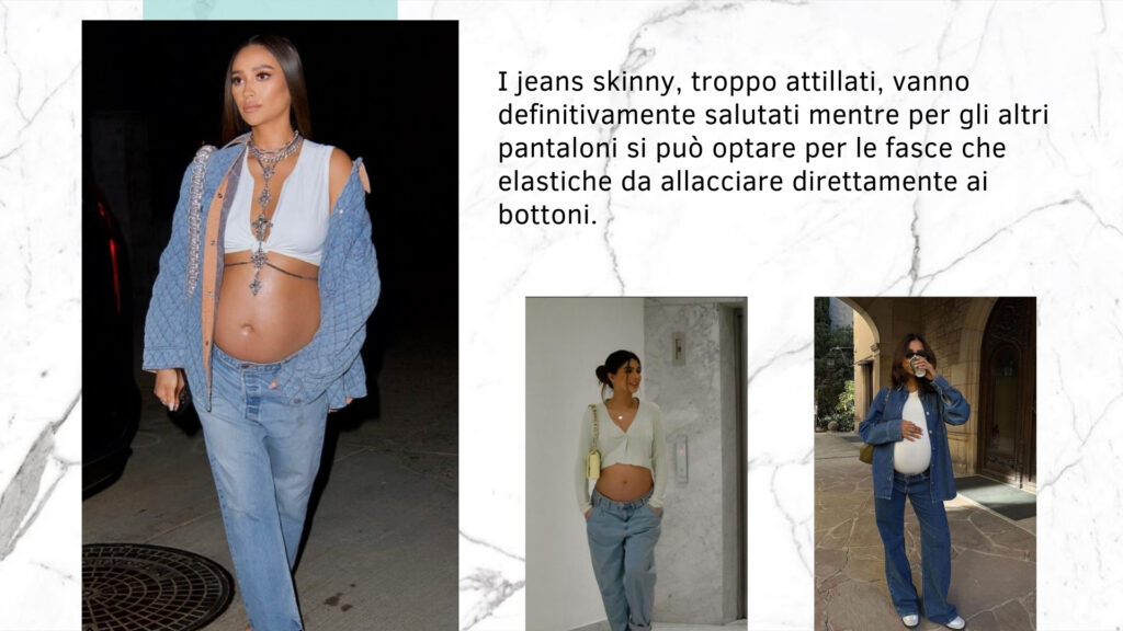 I jeans skinny, come abbiamo visto, sono troppo aderenti per essere indossati in gravidanza, è meglio optare per modelli più larghi e dal tessuto più morbido.