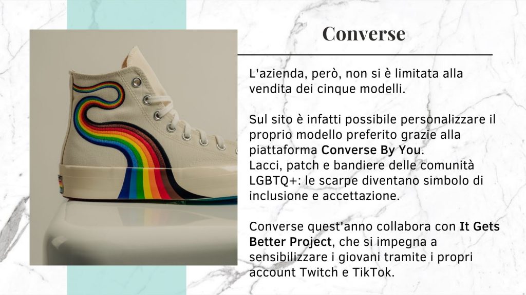 Le famosissime All Star Chuck Tailor, sul mercato dal 1917, si tingono di arcobaleno, questo giugno. In occasione del Pride Month, infatti, Converse ha lanciato una capsule collection creata in collaborazione con cinque artisti LGBTQ+ che hanno creato calzature e abbigliamento a tema.
