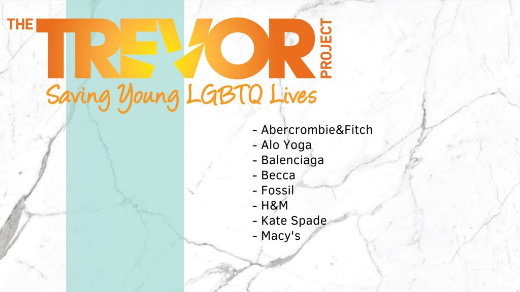 Moltissimi sono i brand che quest’anno hanno deciso di supportare Trevor Project, associazione nata nel 1998 grazie a Peggy Rajski e Randy Stone. Trevor Project è la prima organizzazione che fornisce servizi di intervento in caso di crisi e prevenzione del suicidio ad adolescenti e giovani adulti LGBTQ+.