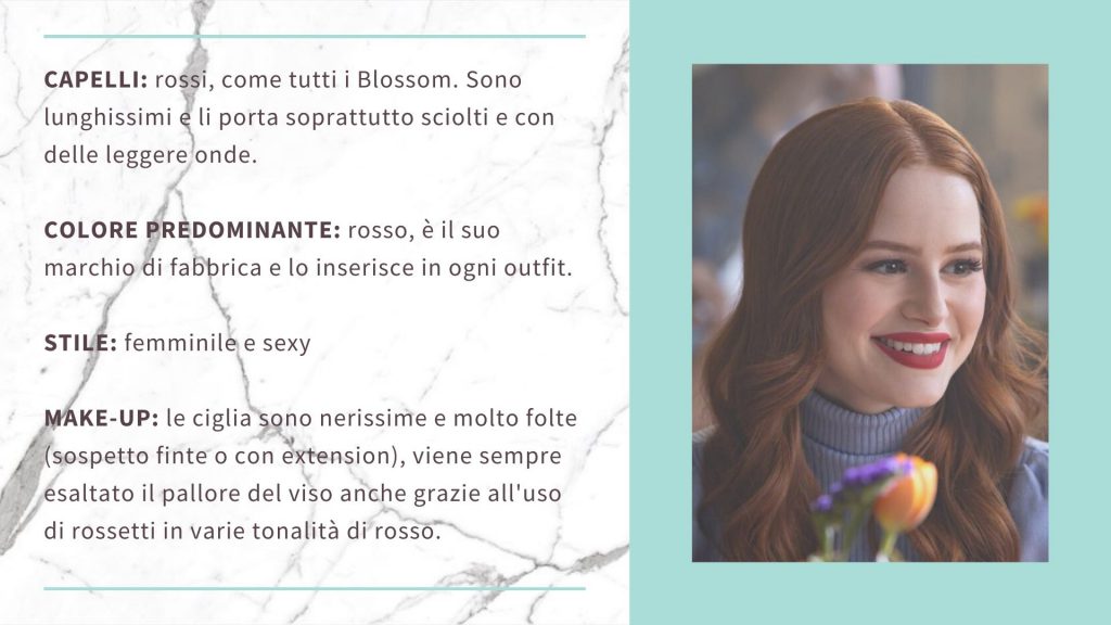 Cheryl è la discendente della famiglia Blossom, la più ricca della zona. Vanitosa e superficiale, all’inizio della serie perde misteriosamente Jason, il fratello gemello. Moltissimi segreti di famiglia verranno a galla durante le indagine, soprattutto sul comportamento della madre Penelope verso Cheryl. L’ultima dei Blossom nasconde una grande vulnerabilità e sofferenza, che puntata dopo puntata trasforma in forma e determinazione.