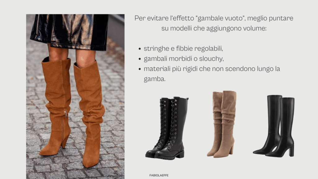 Come per ogni cosa, non esistono stivali “perfetti” in senso assoluto, ma solo quelli che valorizzano le tue proporzioni e il tuo stile personale. L’importante è conoscere i dettagli che fanno la differenza e scegliere modelli che facciano sentire a proprio agio.