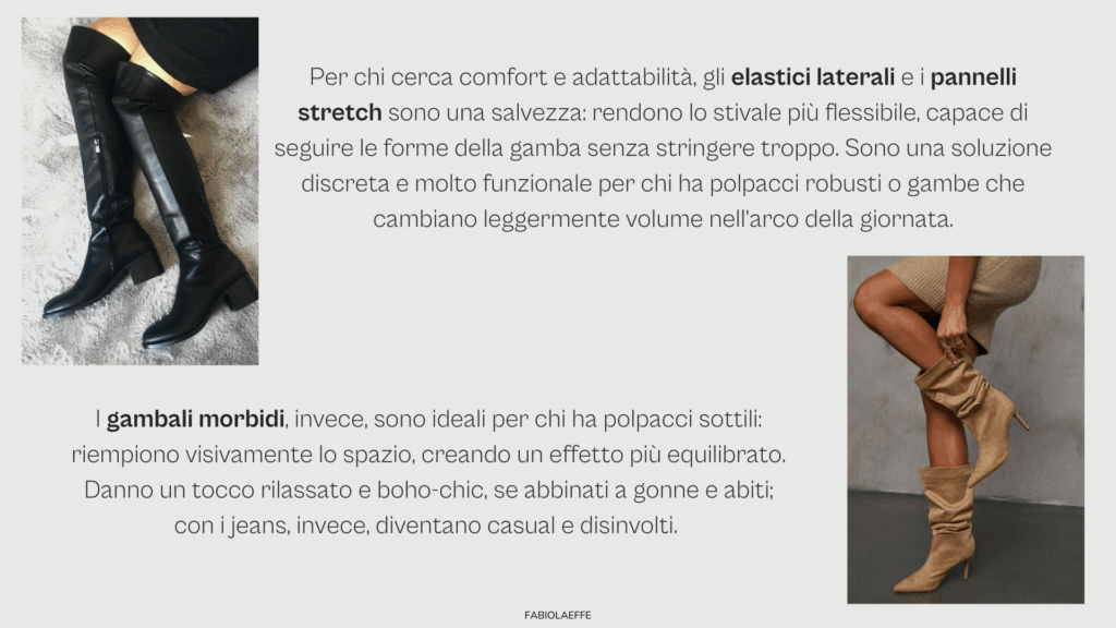 Troppo stretti sul polpaccio, troppo larghi, oppure con un gambale che non slancia come dovrebbe: non sempre è facile trovare il modello che calzi a pennello, e il rischio di comprare modelli “bellissimi ma inutilizzabili” è dietro l’angolo.