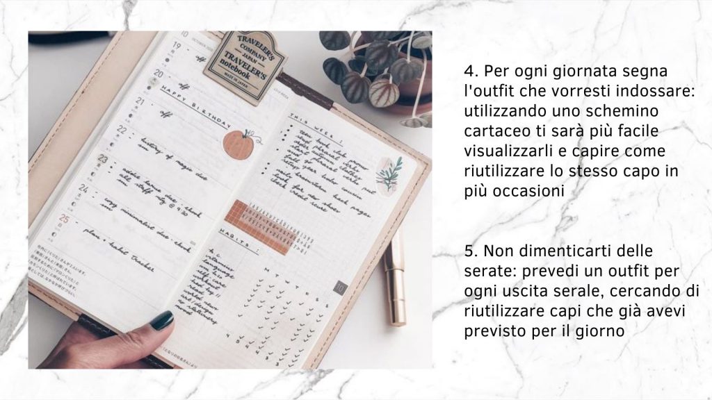 - Prepara uno schemino con i giorni in cui starai via e segna eventuali escursioni o attività programmate.