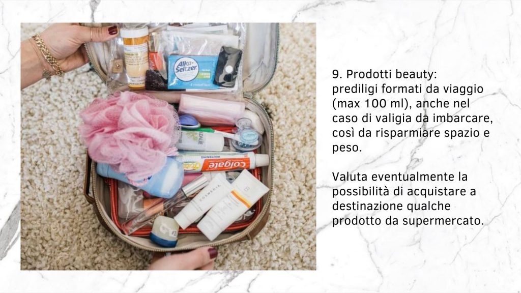 - Prima di tutto, se prenderai l’aereo, informati bene sulle dimensioni e sul peso concessi dalla compagnia aerea. Non vorresti dover pagare un salato sovrapprezzo o lasciar qualcosa a terra, vero?