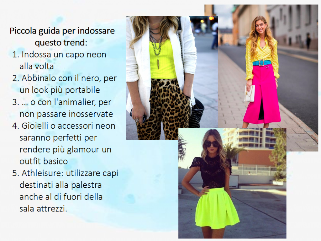 Tasto molto dolente, personalmente parlando, ma che già nelle scorse stagioni aveva fatto impazzire di gioia moltissime di voi. Ebbene si, si riconfermano colori trend per la prossima stagione tutte quelle tonalità che potenzialmente possono farci sembrare degli evidenziatori in movimento.