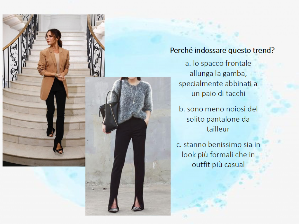 Victoria è un’icona di stile da decenni e ancora oggi, anni dopo lo scioglimento delle Spice Girls, detta ancora moda. Il trend made in Posh per questo 2020? i pantaloni leggermente scampanati con lo spacco frontale che supera di pochissimi centimetri la caviglia.