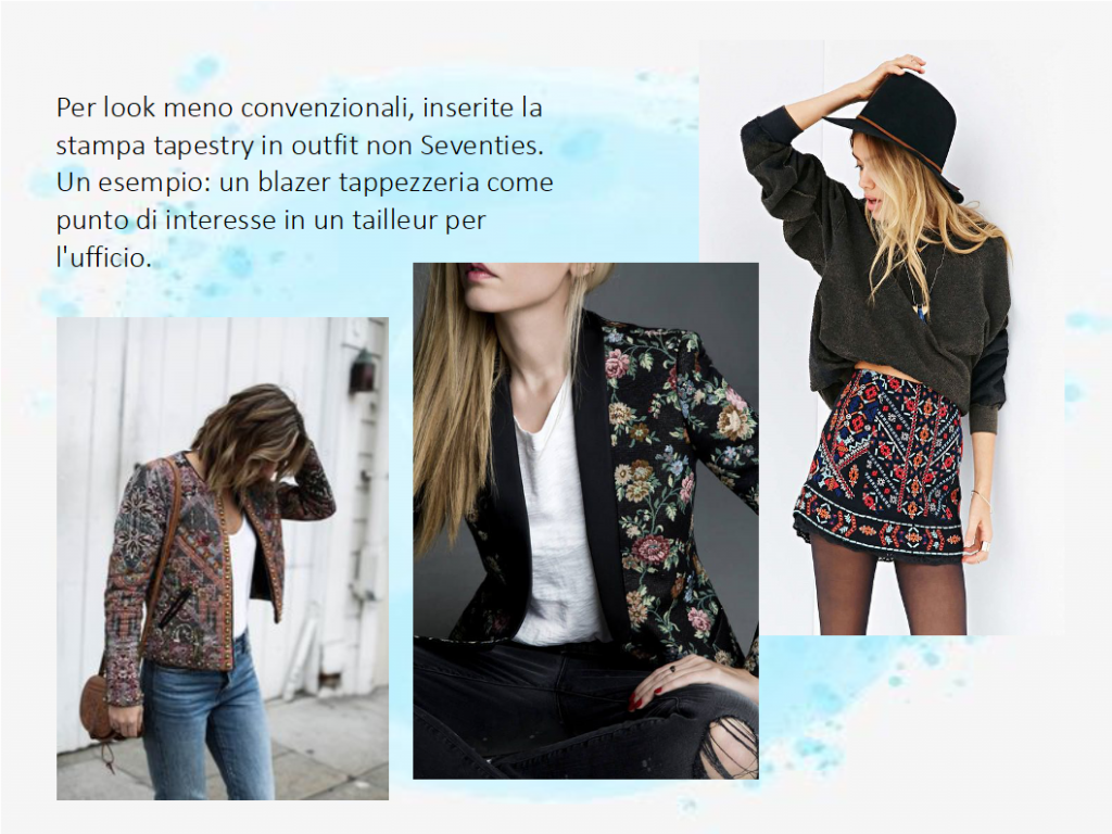 I pantaloni a zampa e lo stile cowboy erano stati una prima avvisaglia: lo stile Seventies sta tornando in auge! Questa primavera faranno capolinea le stampe tappezzeria, sia sulle gonne che sulle giacche: ricami coloratissimi e con incredibili intrecci saranno alleati fondamentali per creare outfit insoliti.