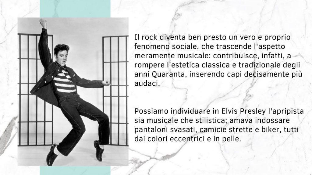 Possiamo individuare in Elvis Presley l’apripista sia musicale che stilistica; amava indossare pantaloni svasati, camicie strette e biker, tutti dai colori eccentrici.