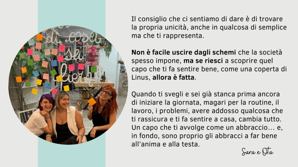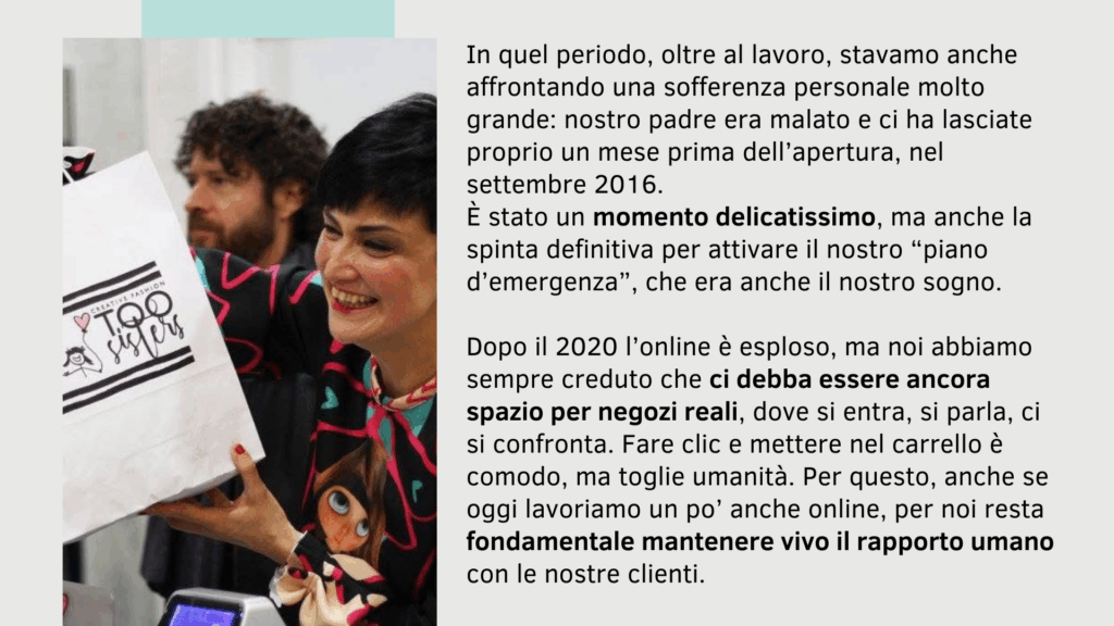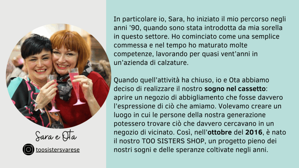 Sara e Ota non sono semplicemente le titolari di un negozio, ma vere e proprie alleate di stile, capaci di tradurre le esigenze delle clienti in proposte concrete, creative e rappresentative. In un’epoca in cui l’omologazione sembra dominare, Too Sisters continua a essere un faro di personalità, stile e relazione umana. Una testimonianza preziosa del fatto che professionalità e originalità possono, e devono, convivere.