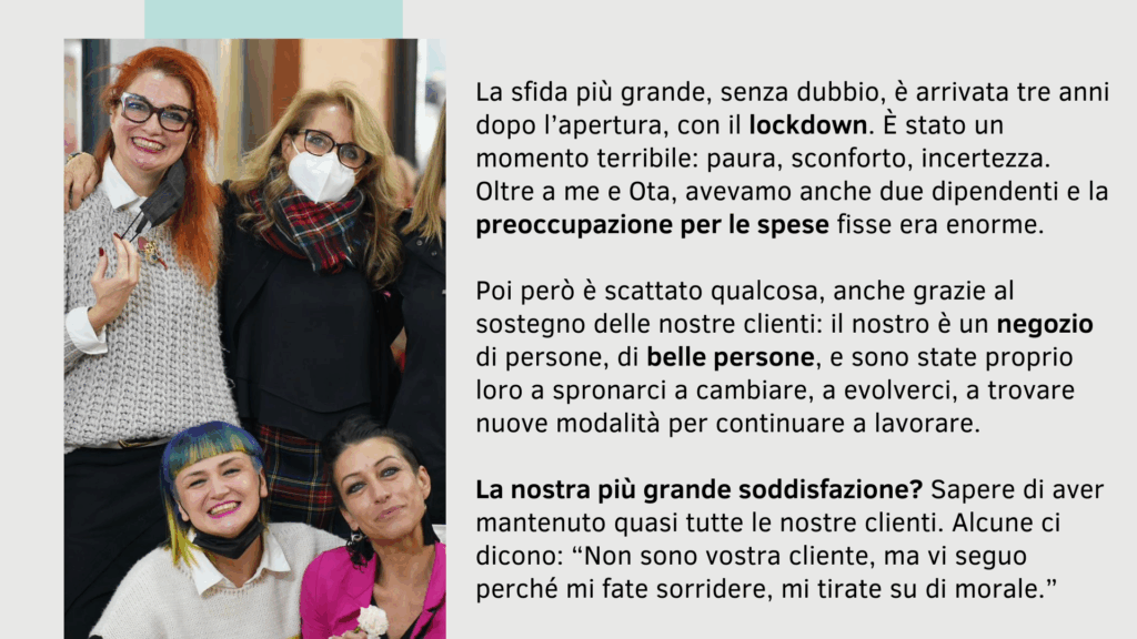 Come accennato prima, lavoravo in un negozio di calzature che iniziava a traballare. In un momento di difficoltà e sconforto, parlando con mia sorella, lei mi ha guardata e mi ha detto: “Sara, è arrivato il momento di realizzare il nostro sogno.” Credo che nei momenti più difficili, le donne tirino fuori il meglio di sé.