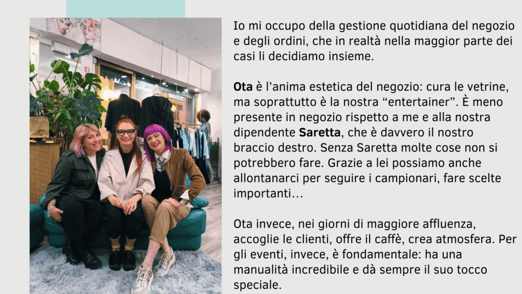 Com’è il vostro approccio con la clientela in negozio? Vi vedete più come venditrici, consigliere di stile, confidenti…?
