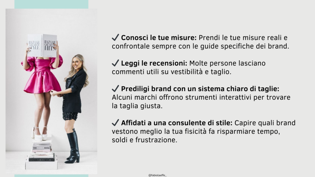 Il problema delle taglie non è tuo, è del sistema moda. La soluzione? Essere consapevoli, imparare a leggere i capi con occhio critico e, quando possibile, affidarsi a chi può guidarti nella scelta.